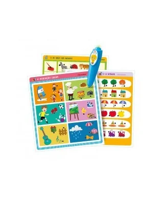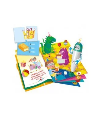 Contém um livro ilustrado que narra uma história e propõe atividades educativas sobre letras, números, operações e associações lógicas a serem resolvidas com a divertida caneta eletrónica.